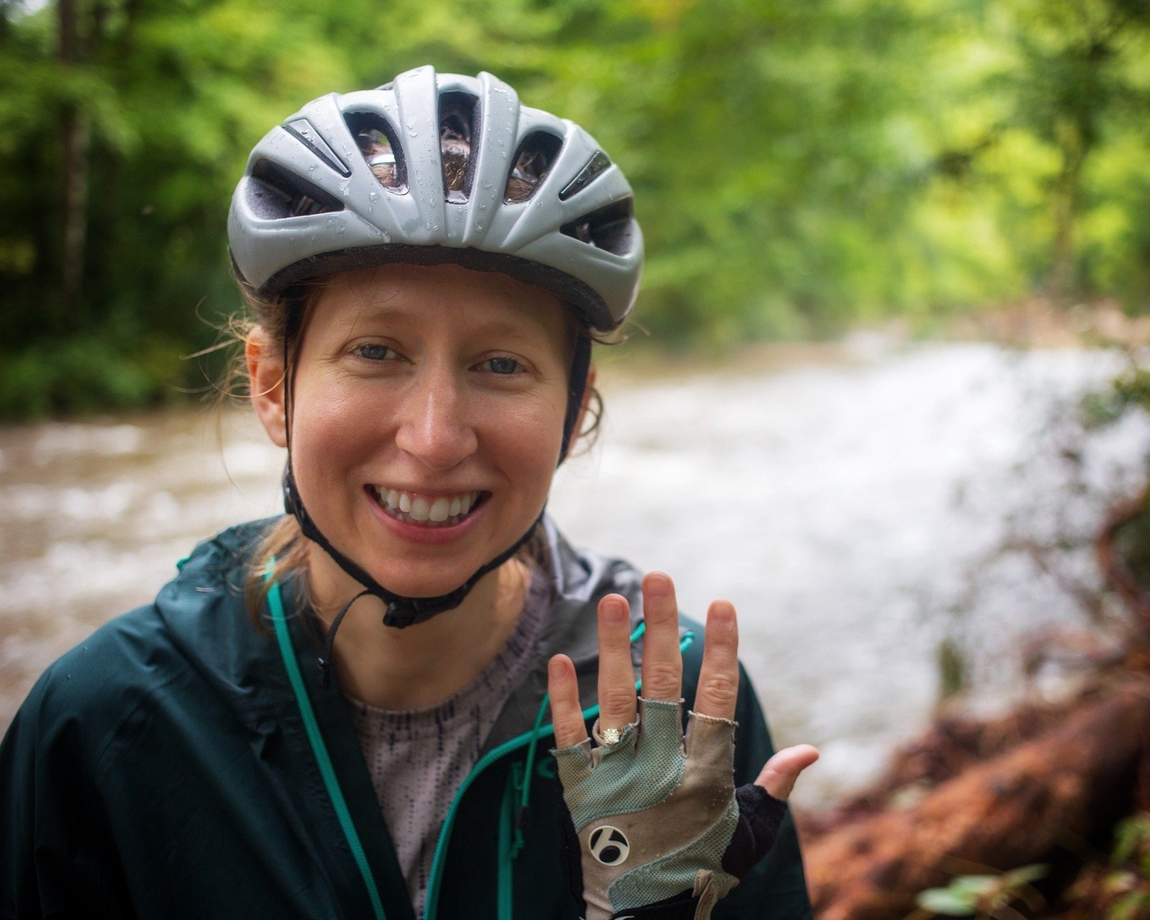 The ride was every bit as easy as the elevation profile had promised, but it was also more beautiful than I’d expected. Visibility improved gradually as we descended and the foggy haze gave way to the vibrantly saturated rain-soaked colors of the forest. We chased each other around switchbacks through the trees. We made a couple brief stops at some overlooks, including the one over Looking Glass Falls. You can typically walk down to the base of the roadside waterfall, but Fred had damaged some of the lower viewing platform and it was taped off. Even from a distance, it was awesome to watch the storm-swollen falls raging. We continued on, stopping once more to walk down to the river. We were within a couple miles of the car at this point and I knew we’d soon be done. So it was there, beside a mess of logs piled up on the bank weeks prior by a storm—not by a secluded waterfall on a forest road just miles away that was now closed and not at one of the dozens of other places we could’ve been before we changed our plans many times over—that I asked Frank to marry me. I don’t know what adventure we’ll plan next, but I know there’s no one else I want beside me when things don’t go according to plan.