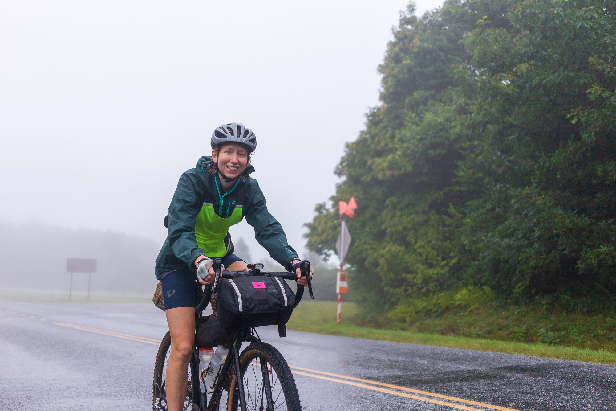 We passed a trailhead parking lot and rolled into the shelter of a bathroom to don our rain jackets. I stuffed my camera in the handlebar bag beneath a couple layers and we rode on. The climb up Bent Creek Gap Road was gradual and generally lovely. The rain accentuated the lushness of the forest surrounding us and for a moment, I could have been pedaling along a coastal backroad in the Pacific Northwest. Soon, we reached the Blue Ridge Parkway and I was reminded of exactly where we were. I knew better—I’d scouted the elevation on Strava the night before—but I’d let myself think the climbing was mostly behind us once we reached the parkway. That was, of course, not the case. We had covered about two-thirds of the distance to the inn, but only close to a third of the elevation gain. My legs seemed to quickly forget the rest I’d graciously granted them just one day earlier and I slowed to a sluggish pace. Frank did her best to continue with encouragement, but her words of motivation understandably morphed into reminders of the importance of beating the worst of the storm. Heavy mist limited our visibility, meaning each new hill was a sneaky surprise. I kept slowing. My legs didn’t ache or strain as much as they simply felt empty while I willed them to keep cranking. At one point, the headwind in a tunnel felt like it might be holding me at a complete standstill. I kept looking ahead to Frank, knowing this ride wasn’t easy for either of us and marveling at how she made it look easy still. Eventually (and I mean that in the truest sense of the word), we passed the first sign for the inn ahead. The next sign came more quickly and then, finally, we were there. We booked a room for the night. It was 10:30, hours before we could check in, but we didn’t care.