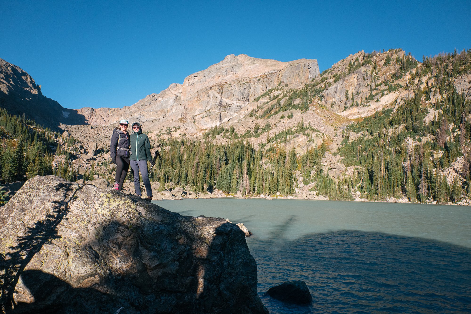 I would’ve loved to stay and watch the sunlight inch its way toward the lake’s surface, but we had more to see. Next up was Nymph Lake—the smallest we’d visit for the day—then Dream Lake. The view from the eastern end of Dream Lake looking west toward Hallett Peak is spectacular and a common photo spot for a reason, but I especially enjoyed the shifting views of the lake and surrounding peaks as we hiked along its northern shore. The trail continues past Dream Lake three-quarters of a mile to Emerald Lake. As we made our way there, however, we encountered a doe elk with her calves in tow near the trail. Out of an abundance of caution, we decided to turn back and give them their space; there were other lakes for us to see anyway. Once back on the other side of Dream Lake, we made our way south to Lake Haiyaha, which offered a unique sight. Earlier in the year, a nearby rockslide deposited glacial silt into the lake, temporarily making its waters an opaque turquoise. This color would eventually fade as the minerals settle and run out of the lake so it was a treat to see it in this moment.