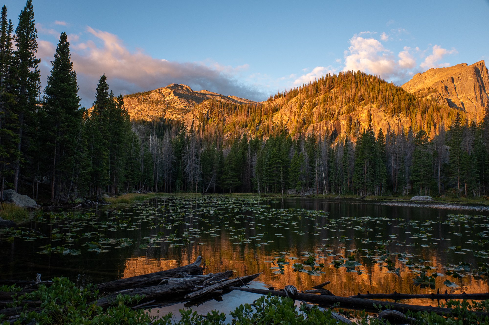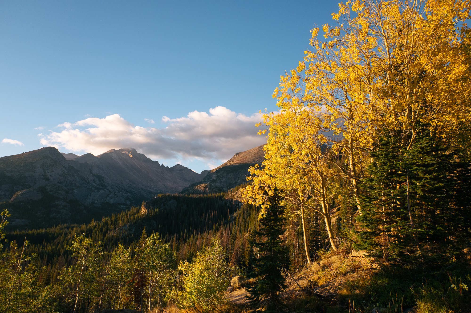 First, we hiked. On our first full day in Colorado, Frances and I set off with Laura to the Bear Lake trailhead. Our goal for the day was a hike linking up a handful of alpine lakes in the eastern part of the park. It was a clear morning, though the temperature dropped quickly as we ascended and I knew conditions could change quickly. One of the best things about the hike was quickly apparent—this wouldn’t be a long trudge to finally reach a viewpoint, but we’d be gifted with great scenery all along the way. The first lake on the list, Bear Lake, was mere steps from the trailhead. While it’s easy to access, Bear Lake isn’t any less worthy of visiting. While a particularly good vantage point was crowded with photographers who’d arrived before sunrise to set up their tripods, we were able to walk a few yards further and enjoy the first golden rays of sun as they hit the treetops.