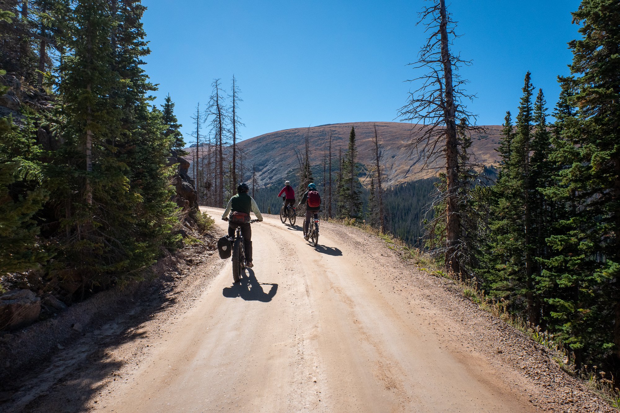 With a healthy dose of optimism, we picked up our rental bikes the next morning and set off for the park. Parking near the eastern terminus of the road, we began with a short section of flat grade to settle in and get used to the electric assistance of the bikes. I’d ridden an e-bike only a few times before and had never taken them on any significant grade, so it took a while to get used to the sensation of going uphill a bit faster than it felt like you were pedaling. Getting up the gradual, winding gravel road still took work, but it required a level of exertion that still allowed us to enjoy the views and talk. Truly, it was a perfect balance. We resolved to keep the pedal-assist at ‘1’ to conserve battery; even at this level, I found myself periodically checking the battery meter and estimating the miles we had left to climb.